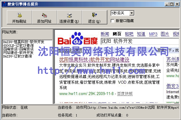 本软件可提升您的网站,在各大搜索引擎中的排名,例如: 百度、谷歌、搜狗 等等.使您的网站获得更多的点击率.最终实现网站推广的目的.效果很显著,2-4周见效,排名保持可以长久有效数月,一年、两年甚至更长.(免费软件、永久更新)强大功能!无需人工看护的全自动执行操作.